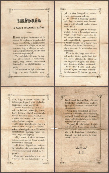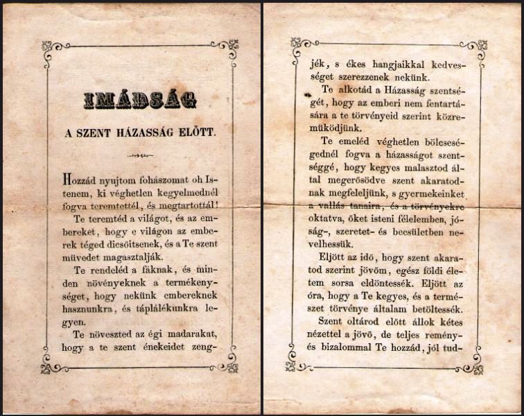 A dokumentum adatai: Imádság a szent házasság előtt. Pest, Emich Gusztáv könyvnyomdája, 1855. [4 p.]