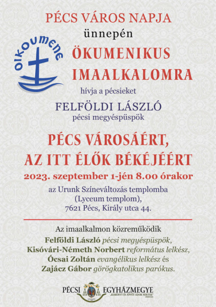 Az Urunk Színeváltozása, ismertebb nevén a Lyceum-templom lesz a helyszíne a szeptember 1-jén reggel 8 órakor kezdődő imaórának, amelyet Felföldi László megyéspüspök kezdeményezett Pécs városáért és az ott lakók békés egymás mellett éléséért. Az ökumenikus imaórán a főpásztorral együtt imádkozik Kisóvári-Németh Norbert református lelkész, Ócsai Zoltán evangélikus lelkész és Zajácz Gábor görögkatolikus parókus.