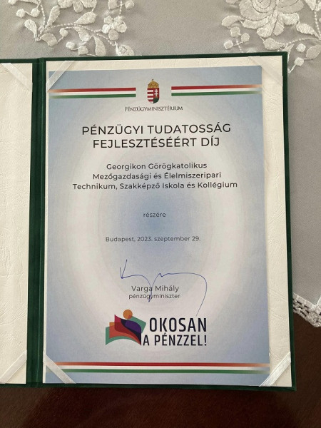A Pénzügyi Tudatosság Fejlesztéséért Díjjal idén három diák és négy pedagógus kiemelkedő munkáját díjazták. Az általános vagy középfokú iskola kategóriában a sátoraljaújhelyi Georgikon Görögkatolikus Mezőgazdasági és Élelmiszeripari Technikum, Szakképző Iskola és Kollégium részére adtak elismerést.