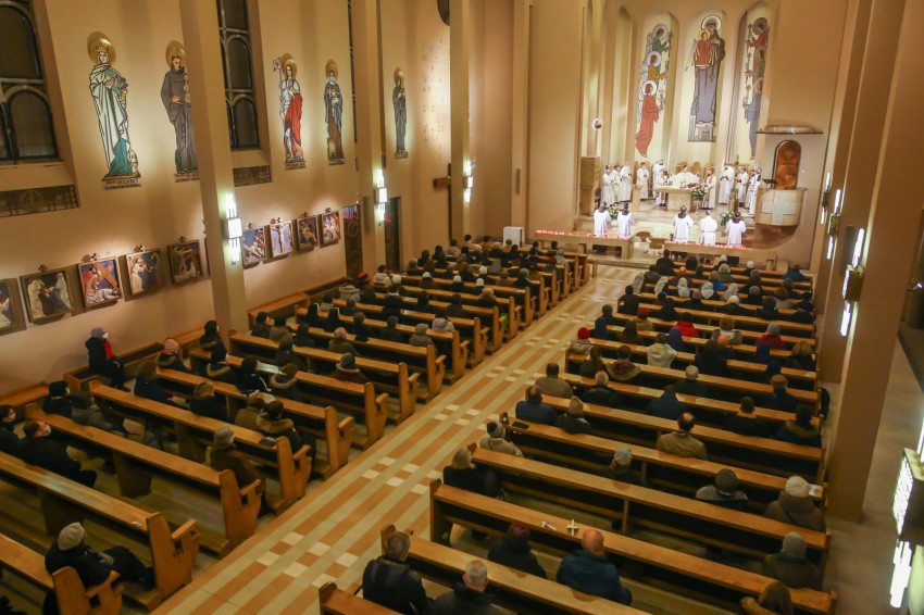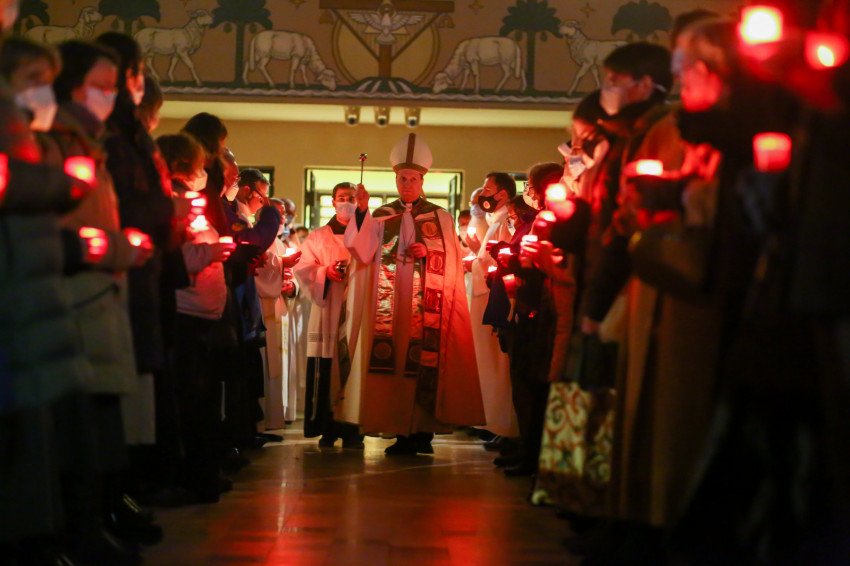 A szentmise előtt a templom elsötétedett. A kezdőének alatt égő mécsessel a kezükben, páros sorban jöttek a szerzetesnővérek a szentély elé és a padok közé, ezt követően a hívő közösség a Sacerdos et Pontifex kezdetű énekkel köszöntötte Mohos Gábort. A püspök a liturgia szavaival megemlékezett arról, hogy Szűz Mária és Szent József, amikor a negyvennapos Jézust bemutatták a templomban, nemcsak az ószövetségi törvényt teljesítették. Ekkor az Üdvözítő találkozott hívő népével. A jámbor öregek a Szentlélektől megvilágosítva felismerték az Urat, és örvendező lélekkel tettek tanúságot róla.
