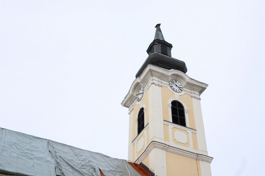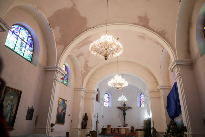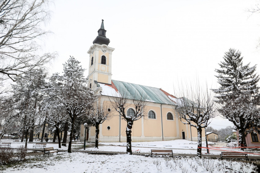 A helyi plébánossal óvatosan bemerészkedtünk a súlyosan megrongálódott templomba, a tetőt kívülről műanyag fólia fedi, de sajnos a beázástól nem tudták megmenteni a szerkezetet, emellett jól látható repedések vannak az épület felsőbb régióiban. A padokat letakarták, hogy a lehető legkevesebb kárt szenvedjék a beszivárgó hólétől. A falak is azért állhatnak ilyen rendületlenül, mert a látszattal ellentétben az épület mindössze húszéves: 1991-ben a szerbek földig rombolták az 1781-ben épült barokk templomot, majd a háború után ennek pontos mását alkották újjá, ezúttal vasbetonból.