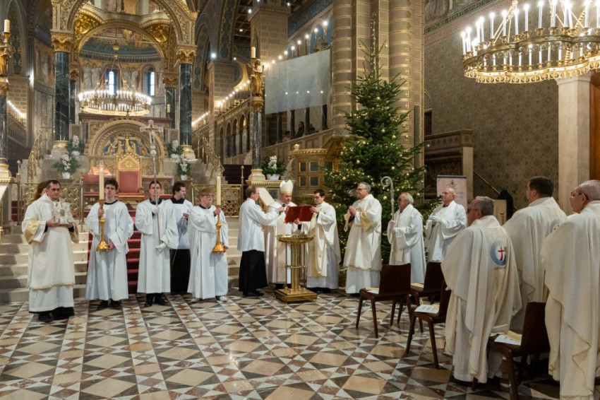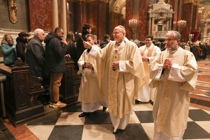 A szentév esztergom-budapesti főegyházmegyei megnyitója ünnepi szentmisével kezdődött a Szent Jobb-oltárnál. A misén mások mellett Mohos Gábor és Fábry Kornél esztergom-budapesti segédpüspök és José Antonio Rodriguez Garcia, az Apostoli Nunciatúra képviselője, illetve az esztergomi Érseki Papnevő Intézet előljárói koncelebráltak.