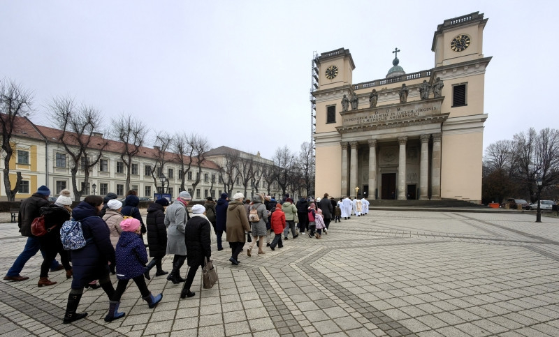 Ezt követően az asszisztencia és a hívek ünnepélyes körmenetben vonultak át a Nagyboldogasszony-székesegyházba a keresztet követve. A püspökkel koncelebrált Varga Lajos váci segédpüspök is.