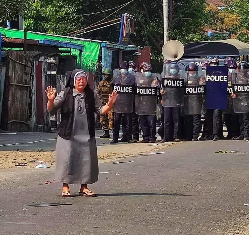 Hozzátette, hogy sok nem katolikus is méltatta Thawng nővért, akinek fotója vírusszerű gyorsasággal terjed a közösségi hálókon. „Több mint száz tüntető talált menedéket a kolostorában. Megmentette őket a brutális veréstől és a letartóztatástól” – hangsúlyozta a főszerkesztő.