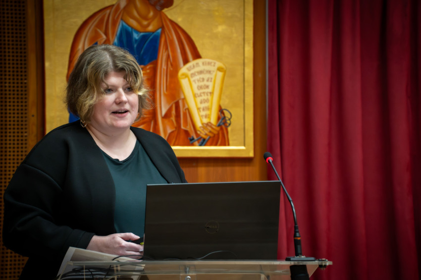 A délutáni szekcióban elsőként Sereghy Xénia, a linzi katolikus egyetem adjunktusa A rítusordinariátus szerepe és sajátos kánonjogi vonásairól tartott előadást.