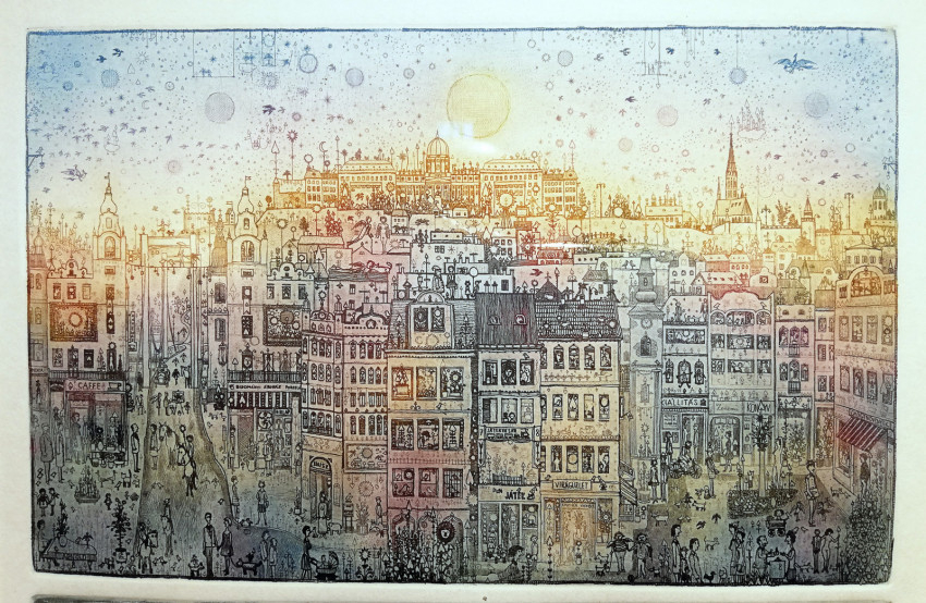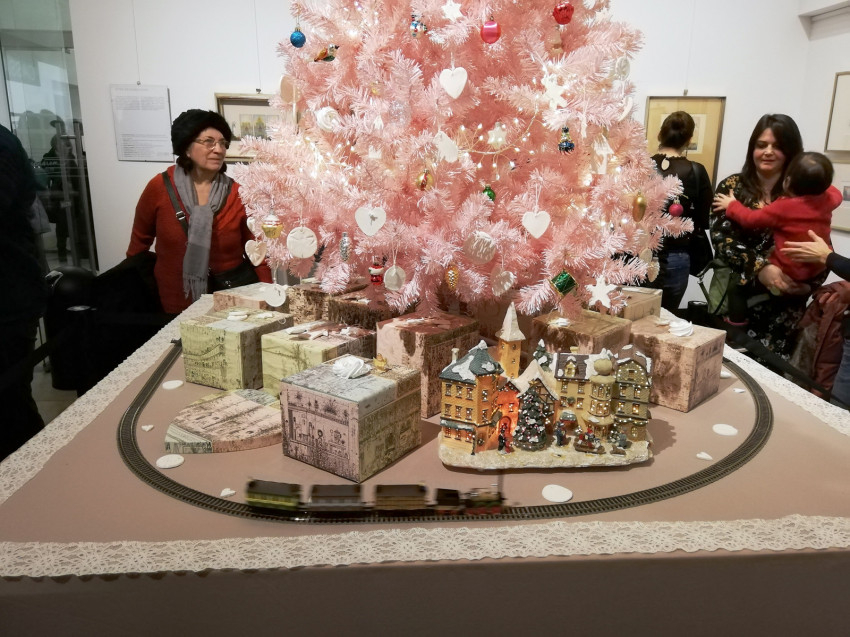 Alatta a mester grafikáival díszített ajándékdobozok, egy minikastély kivilágított makettje, és nem utolsósorban egy kisvasút, amely vidáman szalad az egész karácsonyi installáció körül. Ez a látvány fogadja a nem csupán töltött káposztára, hanem kulturális értékekre is éhes közönséget, ha veszi a fáradságot, és elzarándokol a Széphárom Közösségi Tér galériájába.