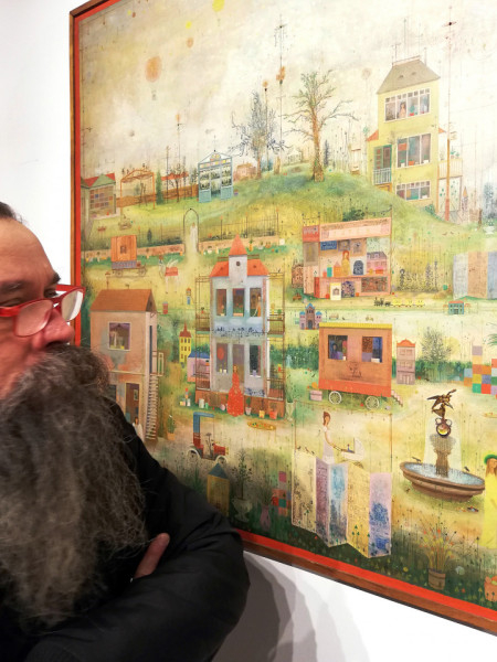 Mi tagadás, kissé félve indultam el a megnyitóra. Azt hittem, tudom, mire számíthatok. Ám a rengeteg alkotás, ez a legalább száz rézkarc, a festmények és a rajzok, amelyek az indulástól kezdve bemutatták egy egész életút kiteljesedését, igazán kellemes csalódást okoztak. A meglepetés erejével hatott rám ez a rendkívüli sokszínűség, ez a gazdag fantáziavilág. „Van az úgy, hogy az ember szeretne máshol lenni, más világban, más korban, más évben, más városban. Amikor belépünk ebbe a kiállítótérbe, van esélyünk arra, hogy egy másik világba jussunk. Különösen akkor, ha ennek a világnak a mestere, képzőművésze Gross Arnold. Abból a nagy sötét, szürkeségből, ami odakint van, a nagyvárosi zajból most megérkeztünk ebbe a mesevilágba. Gross egész művészete egy alternatív, párhuzamos fantáziavilág konok, dacos, elszánt építése. Szerepet játszik, jelmezt húz, színpadot rendez be. Önarcképeiből egy egész sorra valót mutatunk be. Gross ezeken is szerepet játszik, önironikus szerepet: hol madárijesztőként, hol emberként, hol éppen varjúként ábrázolja magát. Az önirónia, a groteszkkel kevert humor nagyon jellemző rá. Minden képe színpad. Gross, ha tehette volna, a művészet köztársaságában szeretett volna élni. Egy olyan világban, amelyben a művészet a meghatározó” – mondta megnyitóbeszédében Révész Emese művészettörténész.