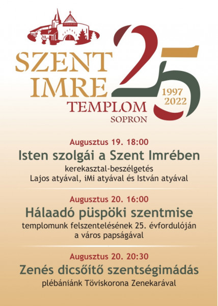 Az ünnepségsorozat nyitánya az augusztus 19-én, pénteken 18 órakor kezdődő kerekasztal-beszélgetés, mely az elmúlt negyedszázad plébánosainak részvételével a visszatekintést, az élmények felidézését hivatott szolgálni. Az Isten szolgái a Szent Imrében címet viselő eseményen Turner Lajos, Kálmán Imre és Németh István plébánosokat hallhatják az érdeklődők.