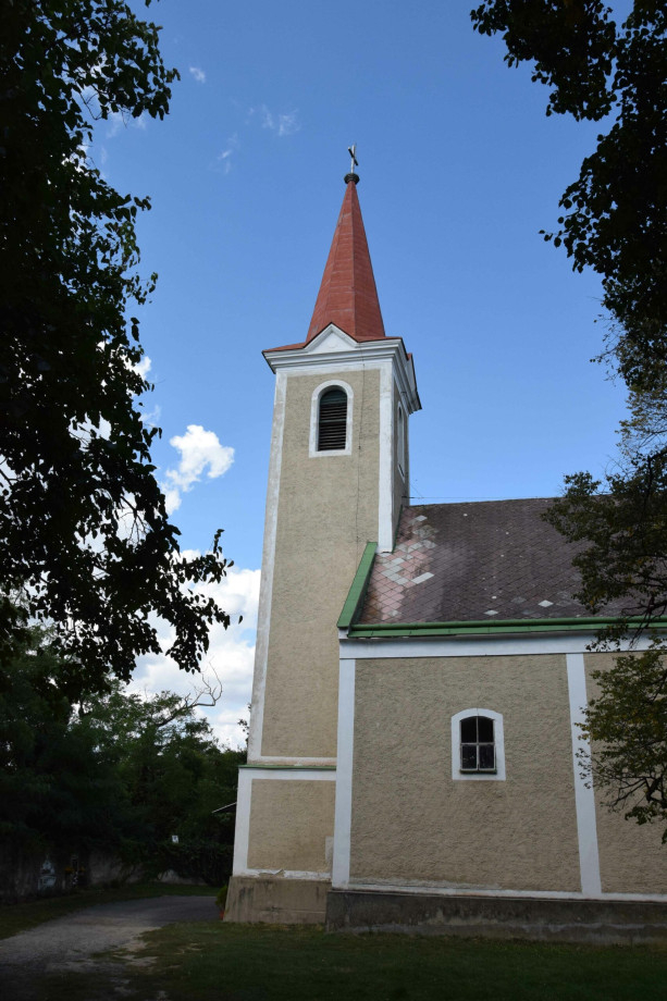 A bejárat a nyugati homlokzat előtt emelkedő toronyból nyílik. Az egyszerű hasábos toronytestet csak a főhomlokzatán nyíló ablakok tagolják: egy szegmensíves tágasabb nyílás felett két kisebb félköríves záródású résablak, majd harangszinten egy nagyobb félköríves helyezkedik el. Szemrevételezés alapján nem kizárt, hogy a torony magába foglaljon középkori falrészleteket.