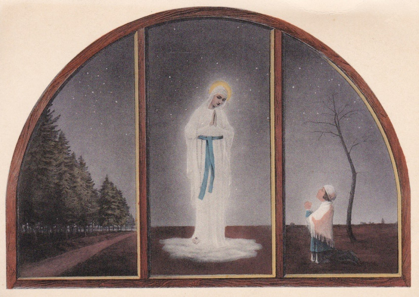 1933. január 15-én Mariette épp a konyhaablakból nézte, mikor érkezik végre haza öccse; kint mindent hó borított, a hideg dermesztő volt, már rég besötétedett. A szél süvített a ház résein keresztül. Amint a kislány nézelődött, egyszer csak észrevett egy gyönyörű hölgyet az udvarukon, akit fényesség vett körül; hosszú fehér ruhát viselt kék selyemövvel, és mezítláb volt. Lábánál egy aranyrózsa hevert. Mariette felfigyelt rá, hogy a hölgy valójában nem a földön áll, hanem valamivel fölötte. Egyszer csak a fehér ruhás hölgy intett a kislánynak, hogy menjen oda hozzá. Mariette próbált racionális lenni, és elmagyarázta magának: annak, amit lát, semmi értelme; amit lát, talán csak az olajlámpás tükröződése – át is vitte a lámpást a szobába. Amikor visszatért a konyhába, a hölgy még mindig ott állt. Mariette hívta édesanyját, s elmondta, mit lát odakint, de ő csak megrázta a fejét, és leszögezte: „Ostobaság.”