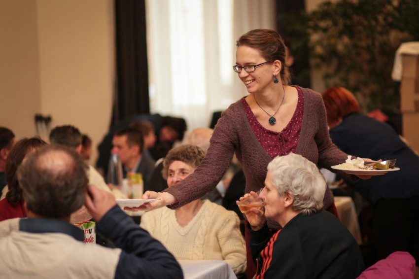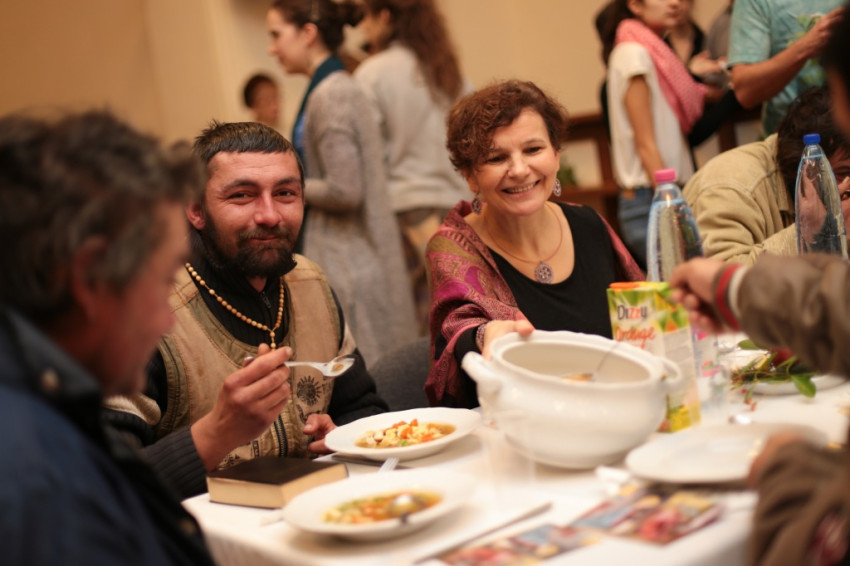 Ünnepi hangulatban telik az ebéd, névre szóló ajándékokkal kedveskednek a meghívottaknak. Az asztal körül ülők jó barátai egymásnak, év közben is rendszeresen találkoznak: a közösség tagjai a hajléktalanokat látogatják az utcákon; az intézetben élő idősekhez hetente elmennek, hogy egy kis társaságot, vidámságot vigyenek nekik, nyáron pedig együtt nyaralnak velük.