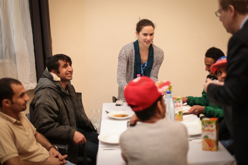 A szentmise után a jezsuita Párbeszéd Házában látták vendégül az utcán élőket és a szegény családokat, valamint néhány jemeni menekült barátjukat, akik jelenleg a bicskei menekülttáborban élnek. Az ebéden részt vett Székely János püspök, Forrai Tamás jezsuita provinciális, illetve Sajgó Szabolcs, a Párbeszéd Háza igazgatója is. A felszolgálásban segítettek a Katolikus Shalom Közösség tagjai is. Az ebéd elején Szőke Péter, a Szent Egyed közösség magyarországi vezetője köszöntötte az egybegyűlteket, majd Székely János és Sajgó Szabolcs is üdvözölte a közösség vendégeit.