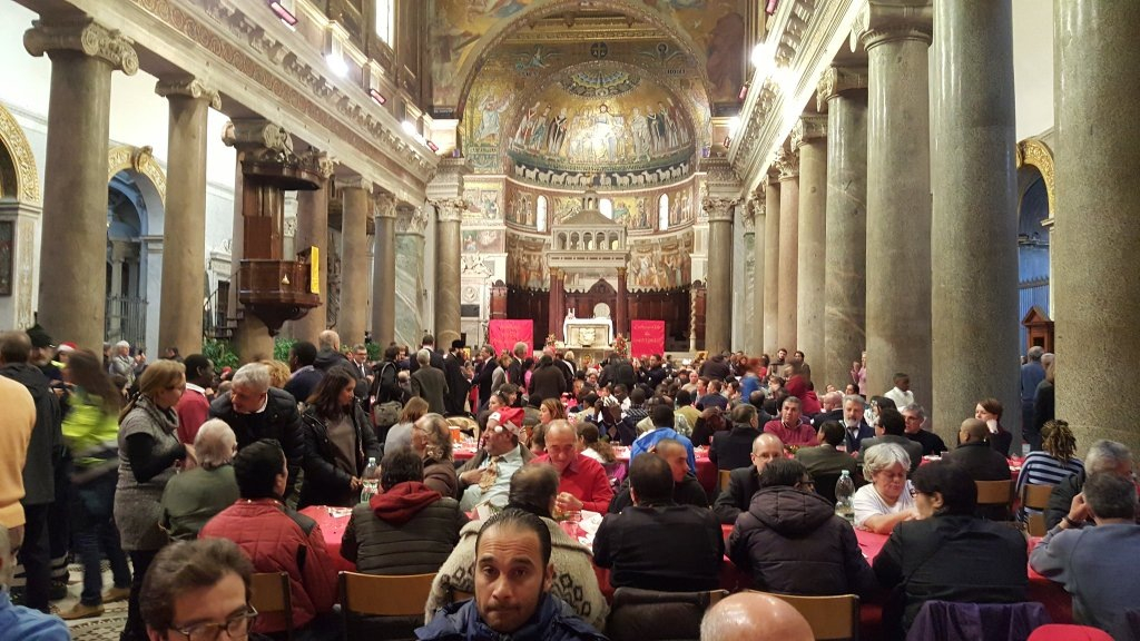 Idén a Santa Maria in Trastevere-bazilikában rendezett ebéden – amelyen hatszáz embert láttak vendégül – részt vett Pietro Parolin bíboros, szentszéki államtitkár. Körbement az asztalok között, üdvözölte közösség meghívottait, a hajléktalanokat, időseket, roma családokat és a menekülteket. Az ebéd végén köszöntőjében így szólt: „A pápa üdvözletét hozom nektek, aki szeret benneteket és közel áll hozzátok. Ott voltam, amikor elmondta Urbi et Orbi üzenetét a Szent Péter téren, és megemlékezett azokról az országokról, ahonnan néhányan közületek érkeztek. Ez az együttlét szép példája annak, hogy lehetséges az együttélés. Finomat ettünk, egymás mellett ültünk, és ami a legfontosabb, megtapasztaltuk a testvériséget és a kölcsönös szeretetet. Mindannyian Isten gyermekei és egymás testvérei vagyunk. Boldog vagyok és meg vagyok hatódva.”