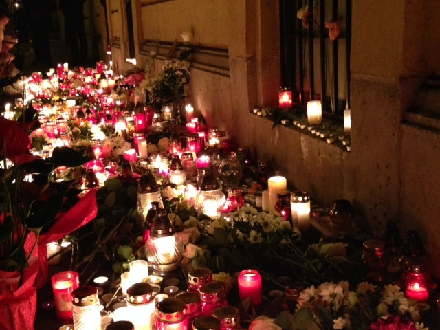 Gyertyák és mécsesek a budapesti Szinyei Merse Pál Gimnázium előtt