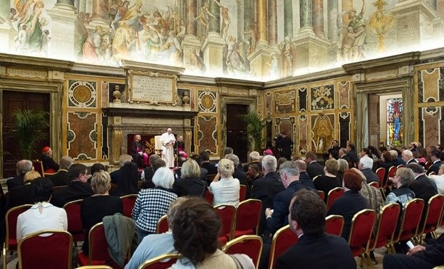 II. János Pál szentté avatása új impulzust adott a munkátoknak az egyház és az evangelizáció szolgálatában. Ha ez egyáltalán lehetséges, még inkább egyetemessé tette a tíz éve elhunyt Szentatya kultuszát, amellyel Isten népe adózik neki. Ti pedig értékes hozzájárulást nyújtotok ahhoz, hogy ennek a szent pápának lelki öröksége továbbra is megtermékenyítse az egyház egészét – kezdte beszédét Ferenc pápa.