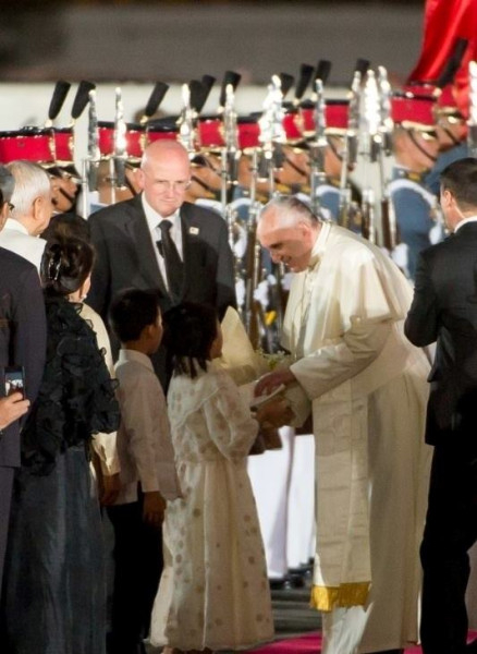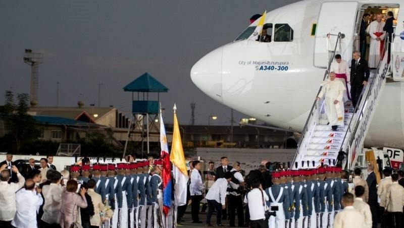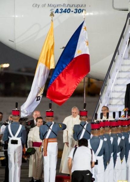 A manilai légibázison hatalmas lelkes tömeg várta a Szentatyát. Az előző pápalátogatásra húsz évvel ezelőtt került sor, amikor Szent II. János Pál utazott a Fülöp-szigetekre. Országszerte megkondultak a harangok, amikor Ferenc pápa megjelent a repülőgép ajtajában. Gyermekek százai tánccal és kis Fülöp-szigeteki és vatikáni zászlókat lengetve köszöntötték. A hivatalos fogadó küldöttséget III. Benigno Aquino elnök vezette. A gépből kilépve a nagy szél elfújta a Szentatya pileólusát fejéről, aki elmosolyodott, majd elindult lefelé a lépcsőn.