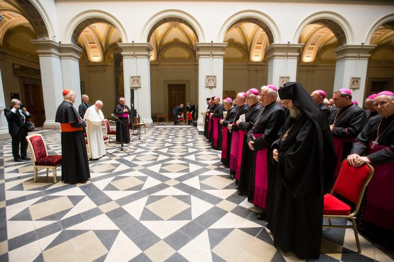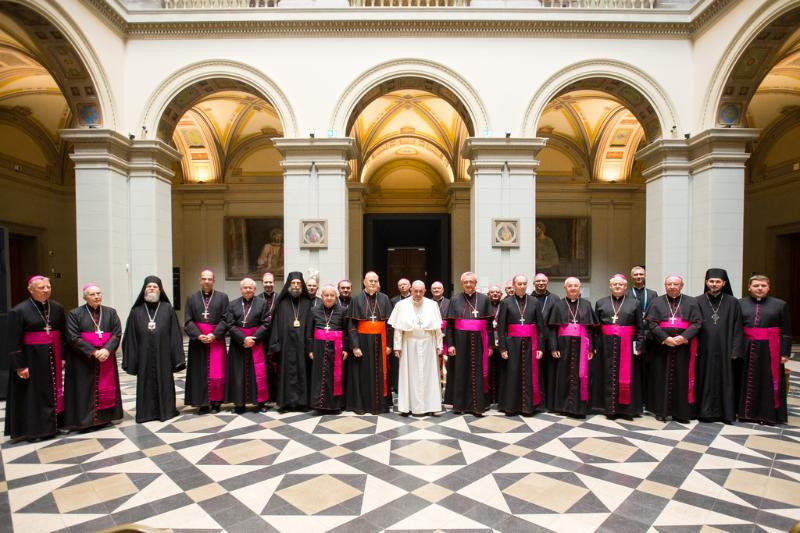 Engedjétek meg, hogy eltérjek a szövegtől és emlékeztesselek a négy püspöki közelségre. A közelség Istenhez az első. Én mint fivér kérdezem: imádkozol? Vagy csak elmondod a zsolozsmát? A szíved imádkozik? Te szánsz időt az imádságra? „De az a helyzet, hogy nagyon elfoglalt vagyok...” De a mindennapi elfoglaltságok közé illeszd be azt is: az imádkozást. Második: közelség egymáshoz. A püspöki testvériség, a püspöki konferencia kegyelem. Egyikőtök se gondolja, hogy ugyanolyan, mint a másik: ez a gazdagság. Igyekezzetek beilleszteni a püspökök egységébe a különbségeket is és ne keressétek a hegymászók kötelének útját. Testvérek mindannyian. Te másként gondolod, mint én, de testvérem vagy. Vitázunk? Vitázzunk. Kiabálunk? Kiabáljunk. De el a kezekkel a testvériségtől: a püspöki Konferencia egységétől. Kegyelem: kérnünk kell. Isten népének megőrzését jelenti a püspökök egységében.