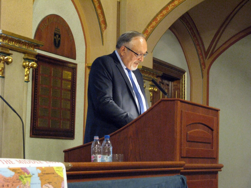A történész-régész végzettségű előadó 1990 és 2015 között teljesített diplomáciai szolgálatot, ebből tizenkét évet a Szentföldön, Izraelben, Palesztinában és Jordániában. Személyes tapasztalatait osztotta meg a hallgatósággal, elsősorban a keresztény közösségek – plébániák – helyzetére fókuszálva. Rámutatott: nemcsak a keresztények, de a zsidók és a muszlimok számára is kiemelt fontosságú hely a Szentföld.