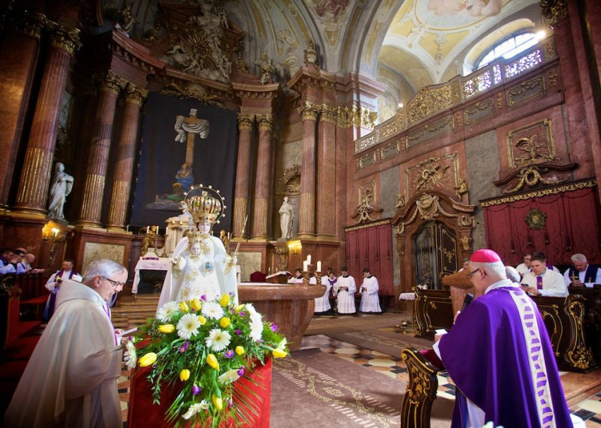 A Mária-szobrot a reggeli órákban hozták a belváros szívébe, a püspöki palotába, ahol már sokan várták érkezését. Spányi Antal megyés püspök kérésére hozták a ferences atyák nemzeti kegyhelyünk szobrát, hogy Szent István városában is tisztelhessék a hívek. Ott, ahol a szent király felajánlotta országunkat a Szent Szűz oltalmába.