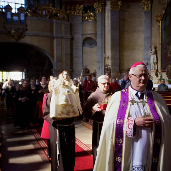 A székesfehérvári püspökségről indult a papság, az asszisztencia, énekesek, cserkész fiatalok, iskolások és tanárok kíséretében az a körmenet, amelynek élén Kálmán Peregrin OFM kegyhelyigazgató vitte a Szűzanya szobrát a székesegyházba.