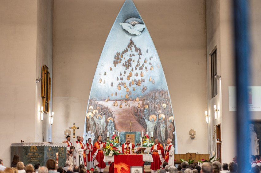Az Úr Lelke betölté a földkerekséget – hangzott a pünkösdi szentmise introitusa, melyre bevonult a papok hosszú sora, Marton Zsolt, Mohos Gábor és Papp Tamás, a Remetekertvárosi Szentlélek Templom plébánosa.