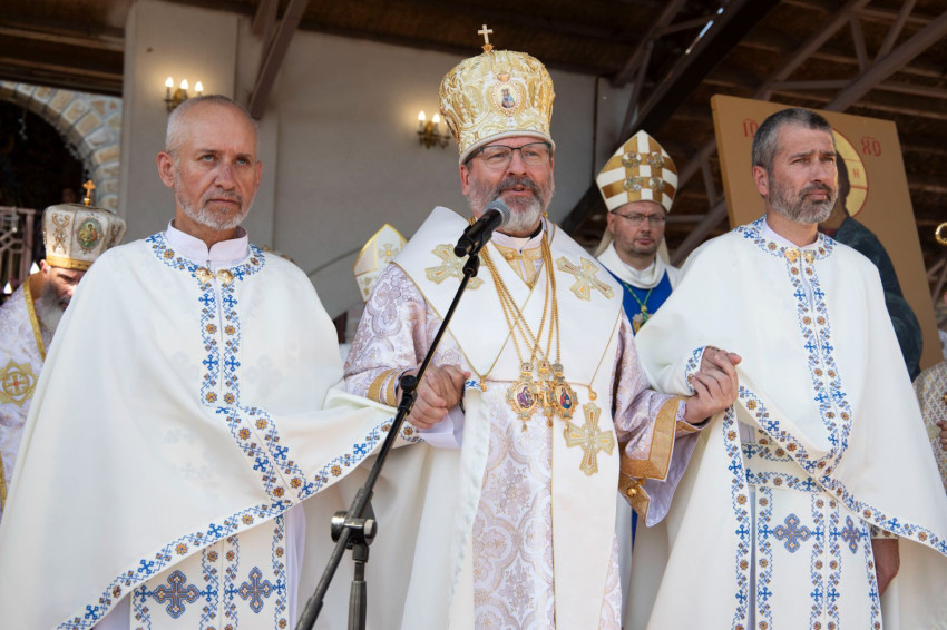„Hálát adunk Istennek, hogy életben vagytok. Ma itt vagytok velünk, és a remény jele vagytok ukránok ezrei számára. Engedjétek meg, hogy anyaszentegyházunk nevében kifejezzem hálámat nektek, és szimbolikus gesztust tegyek: megcsókolom a kezeteket” – mondta az ukrán görögkatolikus egyház feje július 14-én, vasárnap a Zarvanyicában bemutatott Isteni Liturgia végén a fogságból nemrég kiszabadult két papnak.