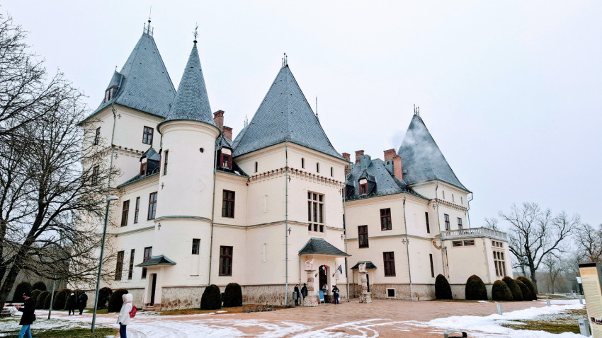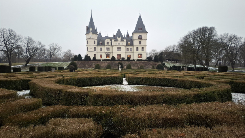 Tiszadobi látogatásunkkor havas a pusztaság, amely felől közelítve már messziről feltűnik a soktornyos kastély gazdagon kiképzett hátsó homlokzata. Az épület maga nem teljesen sík terepen áll, a túloldalról jobban látszik, hogy egy kisebb dombot emeltek a szinte vár benyomását keltő, lenyűgöző épületegyüttes alapjául.