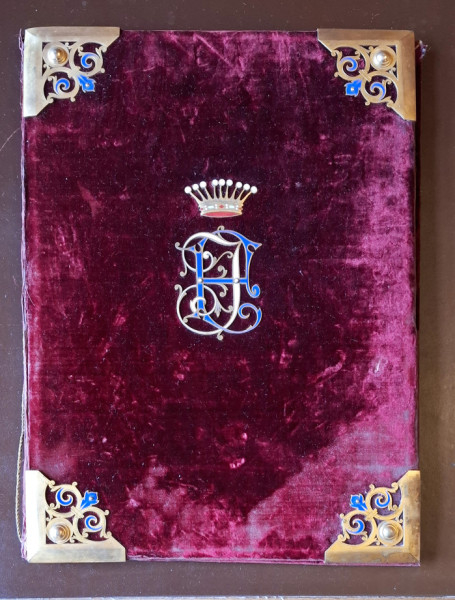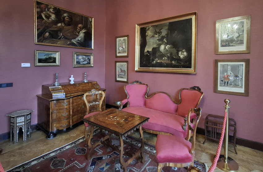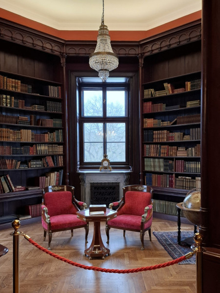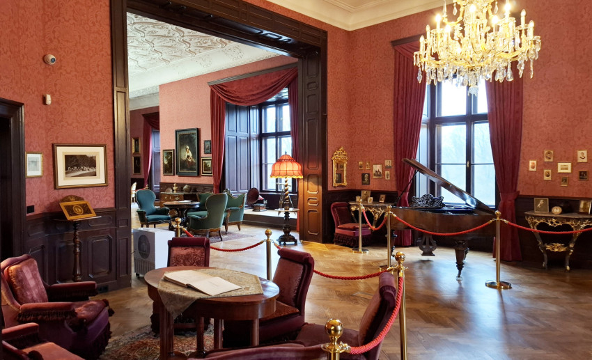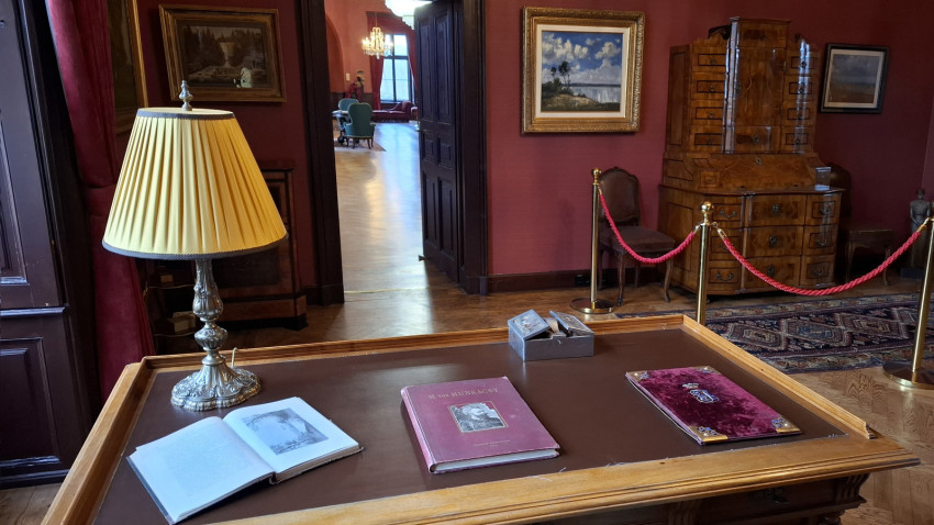 Ha továbbmegyünk, a dolgozószobába jutunk, ahol egy korabeli íróasztalt láthatunk; eredetileg is egy ehhez hasonló állhatott itt. Az asztalon jobb oldalt vörös bársonnyal bevont, díszes, aranyveretes mappát találunk Andrássy Gyula monogramjával. Egy francia nemestől kapta a gróf.