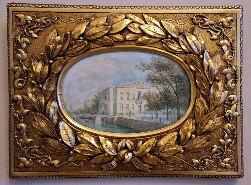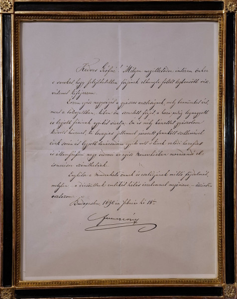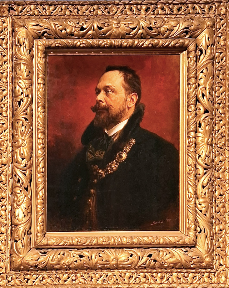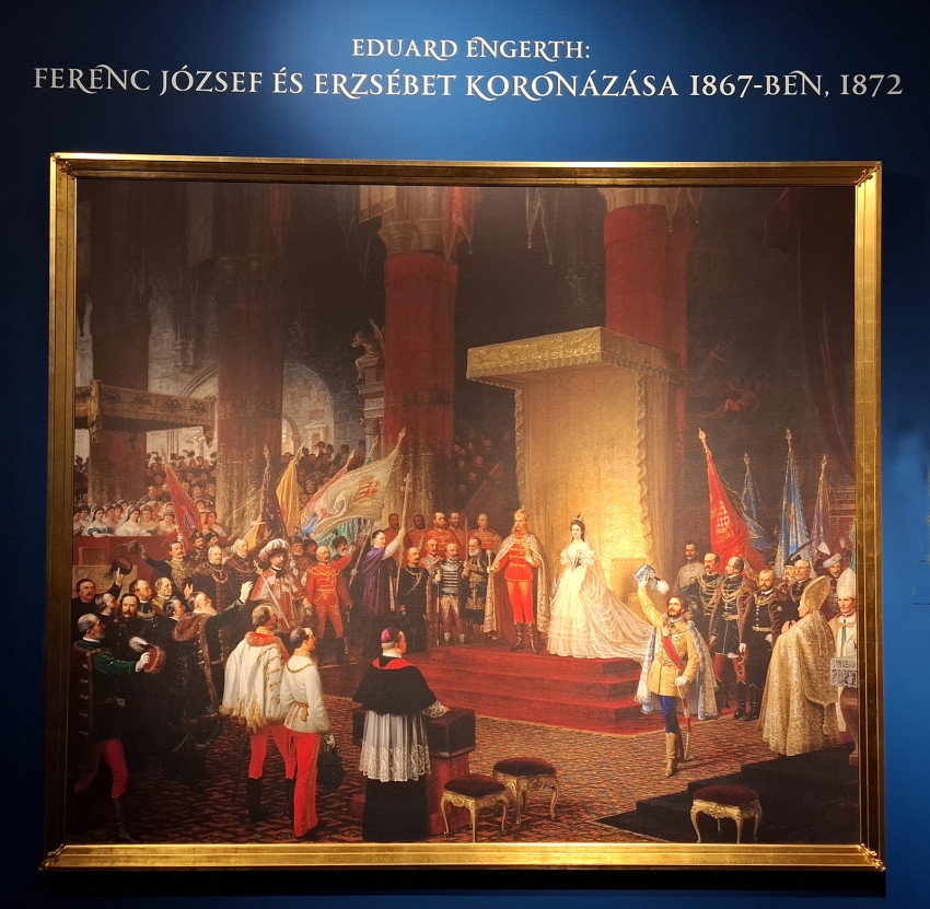 A koronázási ünnepség csúcspontját ábrázoló mű megalkotására a bécsi Akadémián tanító Eduard von Engerth kapott megbízást, aki vázlatkészítés céljából maga is részt vett a szertartáson. A festmény majdnem minden szereplője azonosítható: a pápai követ, a Habsburg-dinasztia főbb hivatalnokai, jobbra, az oltárnál pedig a szertartást celebráló Simor János hercegprímás. A királlyal szemben, a kép bal alsó sarkában a magyar miniszterek állnak, felettük páholyban ülnek a palotahölgyek és az országgyűlési képviselők. A több mint száz szereplő társaságában, a miniszterek sorában találjuk a kiegyezés másik nagy szorgalmazóját, a már említett Deák Ferencet is. Pedig a haza bölcse nem vett részt a szertartáson, korabeli források szerint az esemény idején a lakhelyén, az Angol Királynő szállóban tartózkodott. Kiemelkedő szerepe miatt azonban a bécsi udvar az ő arcképét is megrendelte az alkotótól, aki egyébként saját magát is a főszereplők közé festette. Szakállas arca Ferenc Józseftől balra látható. A koronázást megörökítő festmény a tiszadobi Andrássy-kastély második emeletén berendezett tematikus tárlaton látható. De ne szaladjunk előre, egyelőre maradjunk még a földszinten!