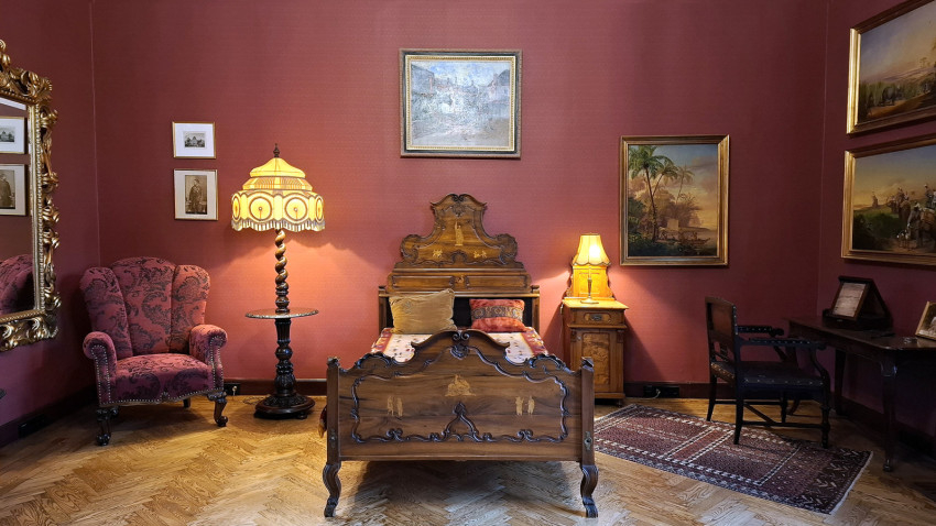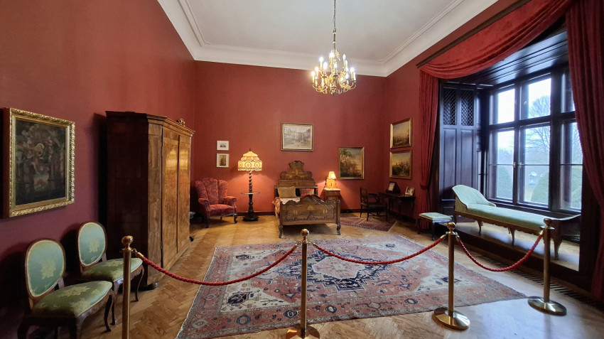 Az ifjabb Andrássy Gyula gróf hálószobájának közepén egy szép, diófából faragott ágyat helyeztek el, amely Andrássy Katinka hagyatékából maradt meg. A támlákat intarziás és figurális jelenetek díszítik, az egész ágyat keleti stílusú takaró borítja. Az épület felújítása során nagy előnynek bizonyult, hogy Klösz György a 20. század elején lefényképezte szinte az összes szobát, így a berendezést a felvételek alapján rekonstruálhatták.