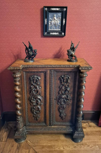 A kastélyban mindössze három eredeti bútor maradt meg. Ezek egyike egy neoreneszánsz, historizáló stílusú kis szekrény, amelyen bronz griffmadarat ábrázoló két gyertyatartó áll.