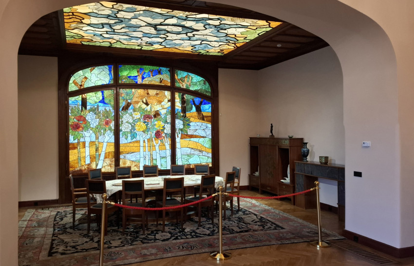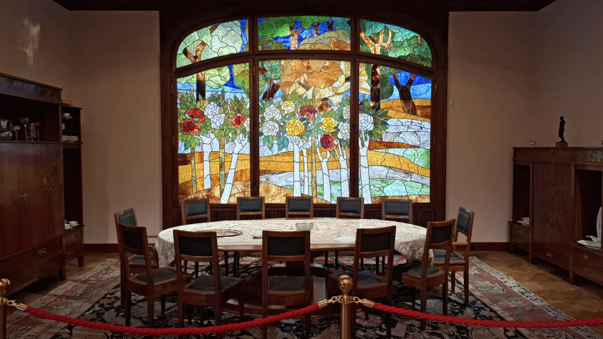 Az ablakszemekről tudható, hogy csak a felső három eredeti, az alsó három rekonstrukció, mivel eredetijük az ingatlan gyermekvárosként való hasznosításának időszakában egy labdázás alkalmával kitört. Az üvegablakokat Róth Miksa műhelyében készítették. A nagy méretű ablak a Rózsalugas címet viseli, a család tőketerebesi birtokának rózsáit ábrázolja. Az ebédlő jobb és bal oldalt látható tálalószekrényeit szintén Rippl-Rónai tervezte, de ezek itt csak másolatok, rekonstrukciók. Az 1950-es években az eredetijüket elégették, viszont szerencsére megmaradtak a tervek, amelyek megtekinthetők a falakon. Az asztalon látható porcelántányérok egy négy-ötszáz darabból álló készlethez tartoztak, mára csupán négy-öt maradt belőlük. Rippl-Rónai tervei alapján a pécsi Zsolnay-gyárban készültek.