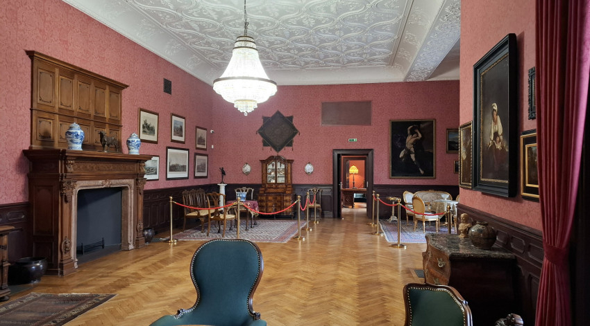 A nagyszalon egykor közösségi tér volt, bálokat, koncerteket és más jeles eseményeket tartottak itt. Az ablakokon kitekintve megpillanthatjuk az úgynevezett hímzéses partert, az épülethez szorosan kapcsolódó kertet. A bukszusok eredetileg legfeljebb tizenöt centiméter magasak voltak, idővel azonban megnőttek, s azóta labirintusnak nevezik az általuk alkotott kertrészt.