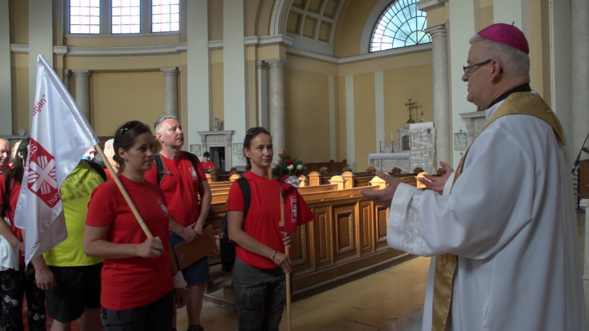 A főpásztor köszöntötte az indulás helyszínén a jubileumi zarándoklat résztvevőit, akik az ország minden részéből érkeztek, tuzenhat egyházmegye karitászcsoportjait képviselve.