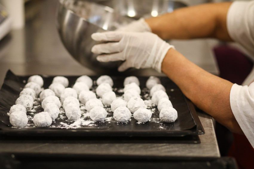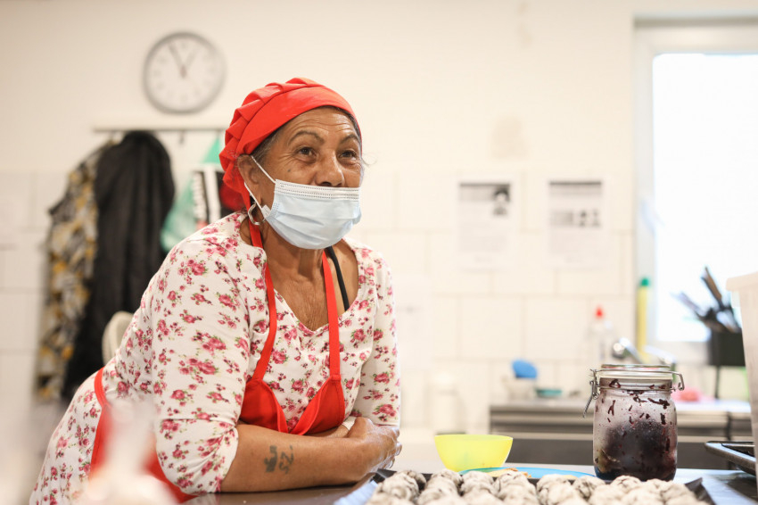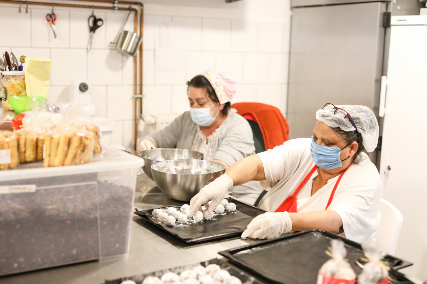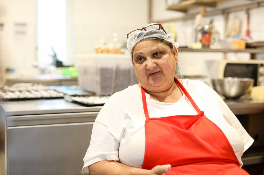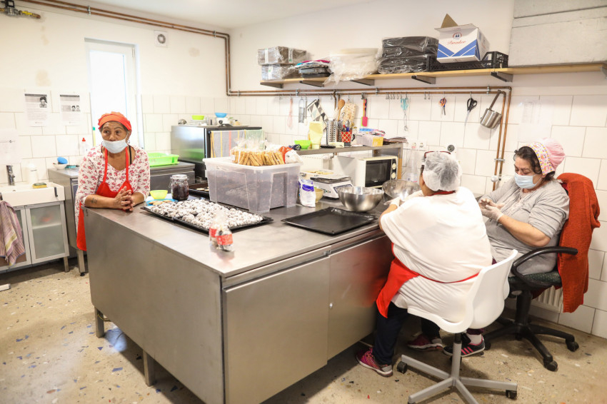 Amikor először jártam a sütödében, még a szeretetszolgálat által működtetett gyerekház kis konyhájában sürögtek-forogtak az asszonyok, de az egyszerű kis gázsütőből már akkor is csodafinom édességek kerültek elő. Azóta felújították a konyhát, a kis sütők mellé professzionális gép is került, de a hangulat nem sokat változott, most is kedves, vidám és családias a légkör, jó ide belépni. Joli, Kata és Babi, három dolgos asszony munkahelye ez jelenleg. Nem könnyű élet van a hátuk mögött: mindhárman négy gyermeket neveltek fel, de még nem pihenhetnek, szükség van a munkájukra. A szavaikból kiderül, szeretnek itt dolgozni.