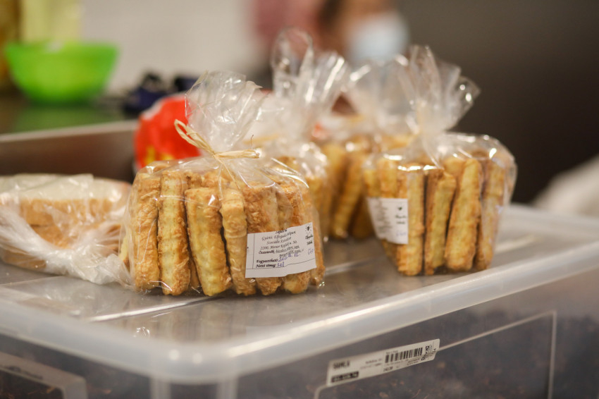 Nézzük a kínálatot! Van zserbó, kókuszkocka, linzerkosárka, kókusztekercs, kekszek, sajtos rúd, sajtos és tepertős pogácsa és még sok minden más. Új termék a csokis és a kókuszos pöffeteg és a levendulás keksz, szépen becsomagolva árulják, karácsonyi csomagolásban is. Igazi ínyenceknek való különlegességük is van: hibiszkuszból készült szirup. A szárított hibiszkuszvirágot Szaúd-Arábiából szállítják a Máltai Szeretetszolgálatnak, és itt főzik belőle a szirupot. Kicsit bizalmatlanul kóstolom meg, de kiderül, nagyon finom. A pátyi üzemben dolgozzák fel a hibiszkusz nagy részét, de jut belőle Monorra is. Az asszonyok nagyrészt belesütik a süteményekbe.