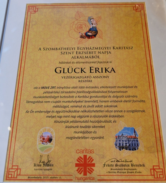Ezt követően Fekete Szabolcs Benedek püspök és Kiss István igazgató átadta köszönetük ajándékát László Juditnak a főplébániai karitászból, Sárközy Violettának a zalaegerszegi kertvárosi plébániai karitásztól; Tolvaj Dezsőnek a vépi karitásztól, valamint külön köszönetüket fejezték ki Glück Erikának, a MOVE Zrt. vezérigazgatójának a sok éve tartó rendületlen támogatásáért.