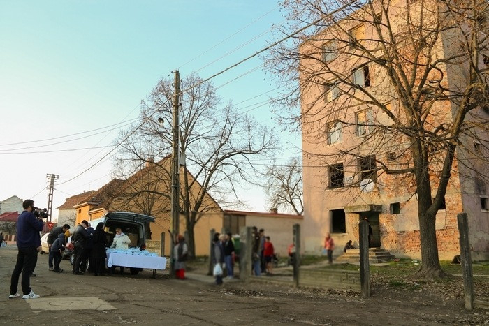 Ezt követően Schönberger Jenő püspök áldásával ételosztásra indultak a segélyszervezetek munkatársai és önkéntesei: az egyházmegyei karitász tagjai a 14-es lakónegyedbe, a Neajlov sétányra; a Máltai Szeretetszolgálat szatmári csoportja az Ostrovului utcai szociális tömbházakhoz; az egyházmegyei kórház-pasztorációs iroda munkatársa, a piarista nővérek, a pasztorális iroda munkatársai, a plébániai szeretetszolgálati tagok és az egyházmegye börtönlelkészséggel megbízott papja pedig a Ion Ghica utcai szociális tömbházakhoz.