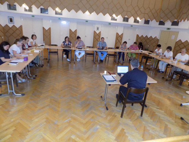 Róbert atya különleges lépcsőfokokon vezette végig a hitoktatókat, melyek mind nagyobb magasságokba emeltek: ember vagyok; hívő, keresztény ember vagyok; keresztény tanító ember vagyok.