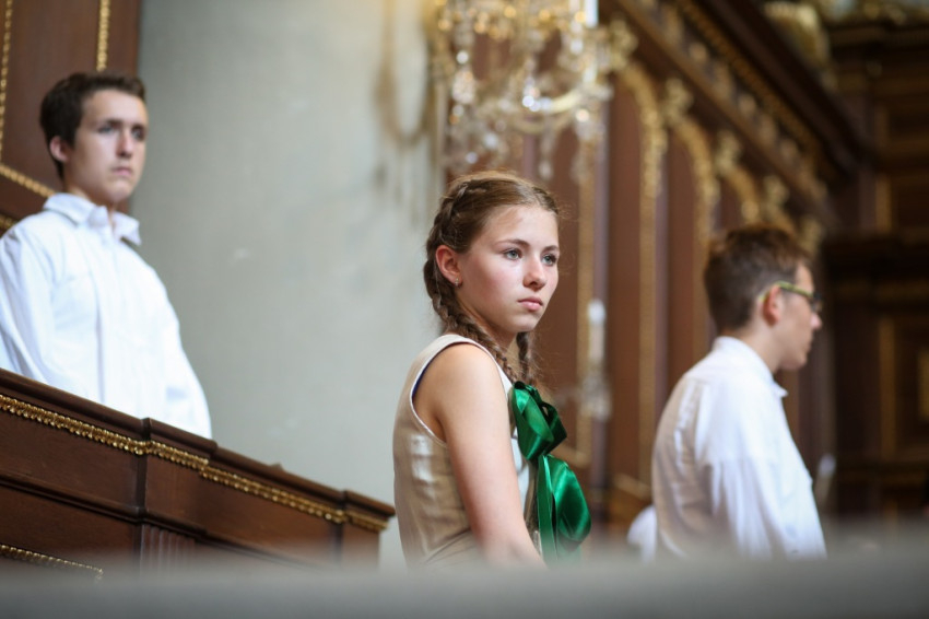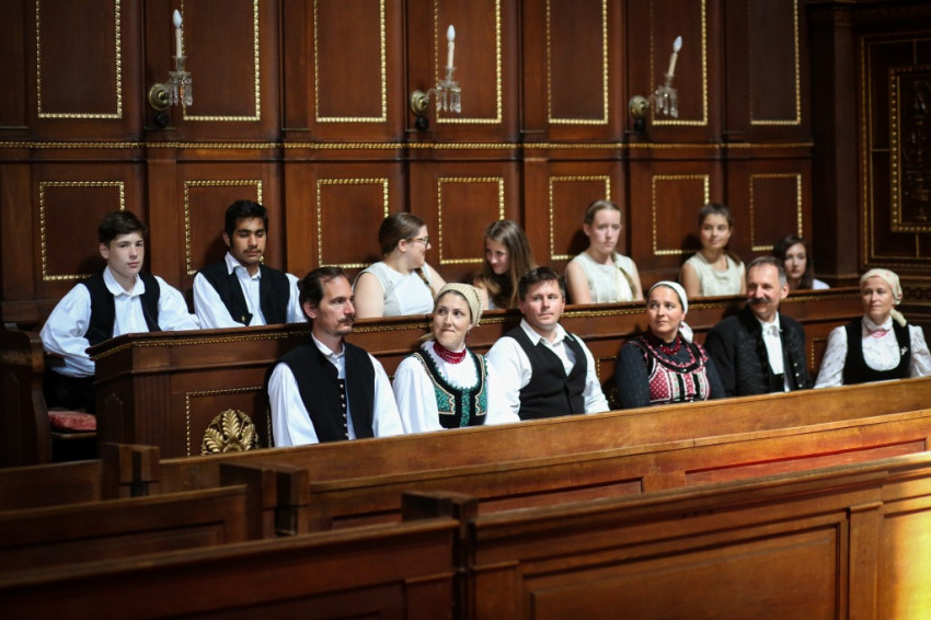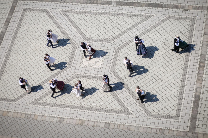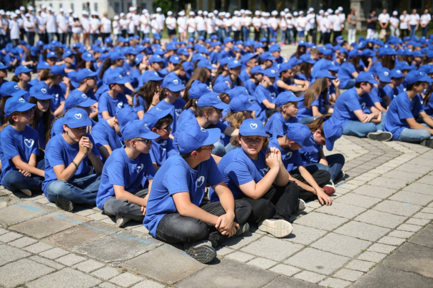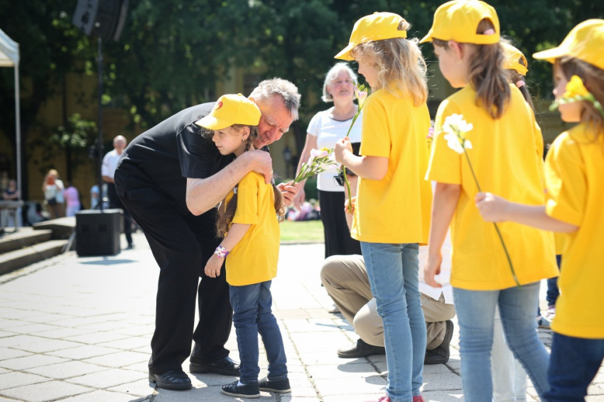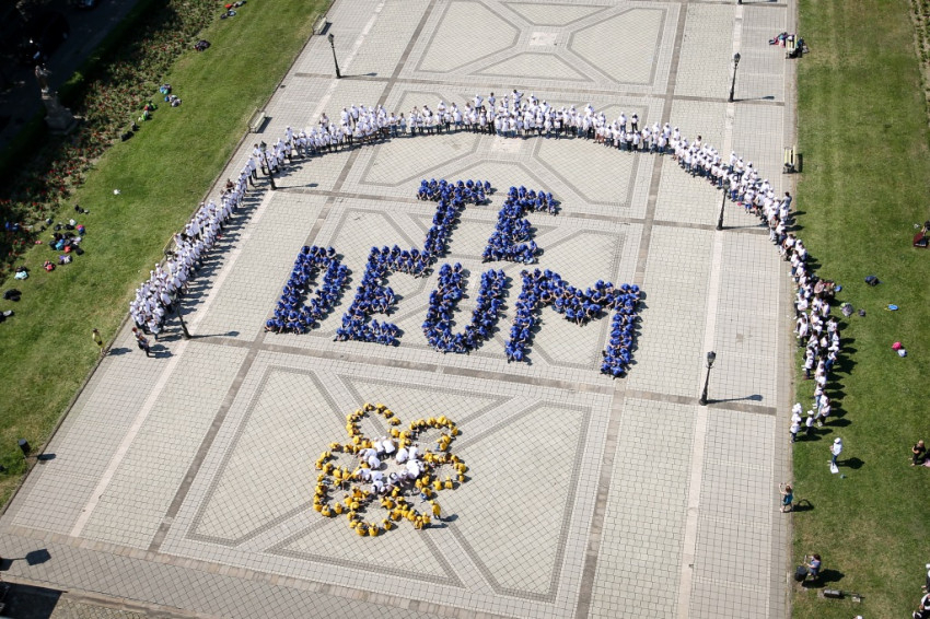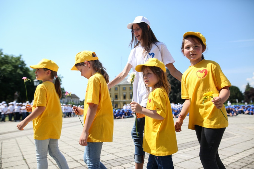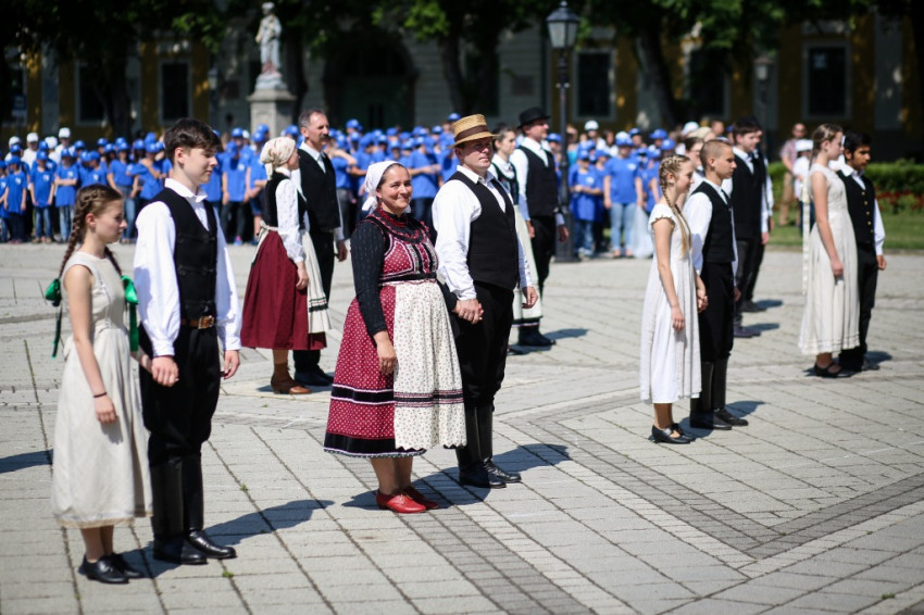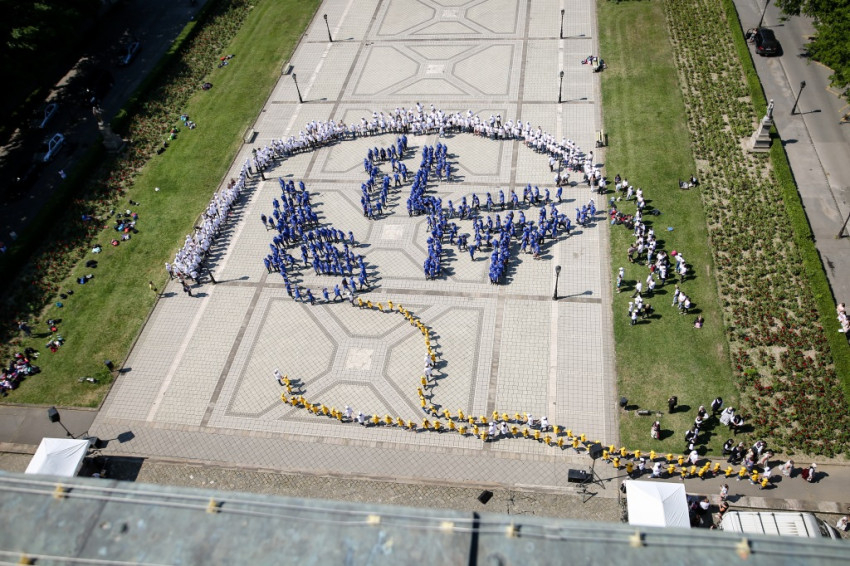 A háromszáz tagú összevont kórus énekét Pécsi Rita és Varga László karnagy vezényelték, majd látványos flashmob következett: a néptáncosok előadása után textiltáncot adtak elő, majd a TE DEUM betűivé fejlődtek fel a téren a különböző iskolák kék ruhás diákjai, míg a fehér és sárga ruhások koszorút és virágot alkottak az írás körül.