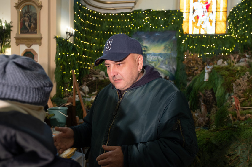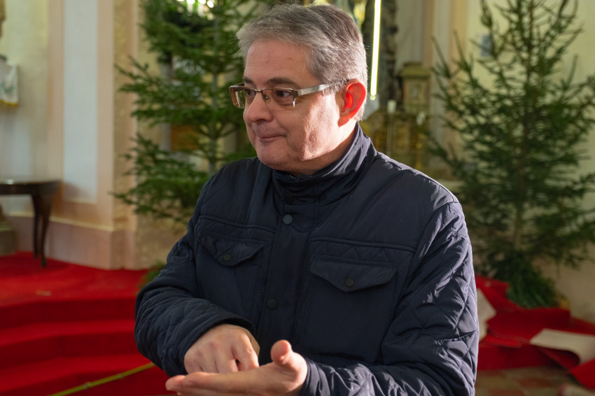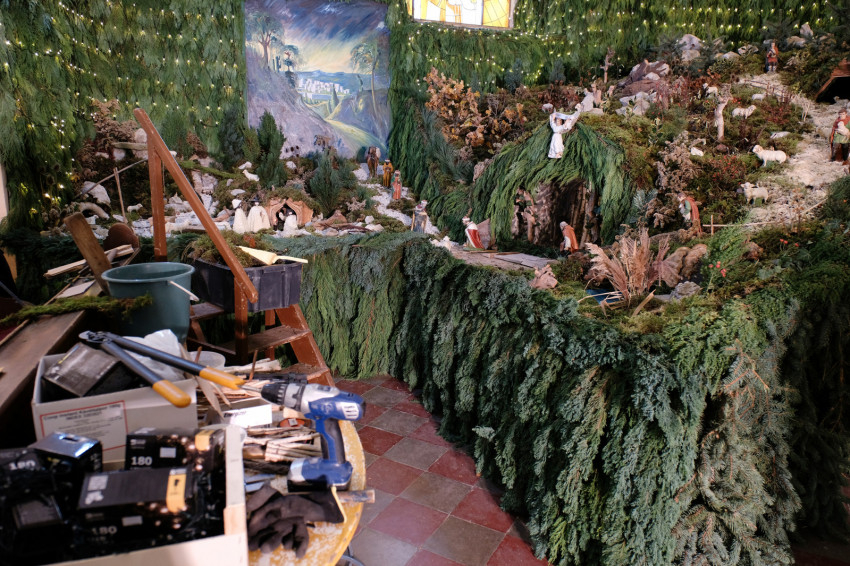 Az első perctől kezdve ott van a csoda születésénél, amely a Jézus Szíve-oltár áthelyezésével kezdődik, majd a betlehem alapjául szolgáló faszerkezet összeállításával és vadhálóval borításával folytatódik. A vadháló különösen praktikus, hangsúlyozza Gere László, mivel könnyű felfűzni rá a tuja- és fenyőágakat. Az építés vezetője minden tereptárgyhoz tud egy történetet, legyen az egy színes kavics, egy érdekes formájú fadarab vagy egy taplókkal borított tuskó. A dekoratív, fodros taplógombák szintén most fognak először szerepelni a kompozícióban; az építők találták, miközben létráért mentek egyikükhöz. Vörsön szokássá vált, hogy aki talál egy különlegesebb tárgyat a természetben, az rögtön felajánlja a betlehemhez. „Már csak néhány marék szalma hiányzik, amit a jászolba teszünk, és el is készülünk” – mutatja Gere László a Szent Család számára előkészített helyet.