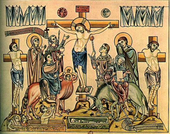 Jézus keresztrefeszítése (Herrad von Landsberg: Hortus deliciarum, 12. századi kódex)