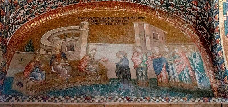 Mária vörös fonalat kap a főpaptól (mozaik, Khóra-templom, Isztambul)
