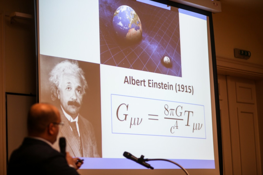 Az előadó rámutatott, Isaac Newton még úgy találta, hogy egy adott csillagra ható erők összege nulla, tehát minden csillag – akkor galaxisokról még nem beszéltek – egy helyben áll. Ez a megállapítás azonban paradoxonhoz vezet – folytatta az előadó –, matematikai úton ugyanis az bizonyítható be, hogy a csillagoknak ez esetben úgy kell mozdulatlanul állniuk, hogy egyszersmind zuhanniuk is kell egymás felé. Ezt a paradoxont Albert Einstein oldotta fel az általános relativitáselmélet keretében: lehetséges, hogy egy test egy helyben áll, és közben a tér nyúlik meg vagy húzódik össze. Erre mondjuk, hogy a tér rugalmas vagy görbült. Adott esetben a gravitációs mező gyengülésével a tér megnyúlik, úgy, hogy a test egy helyben marad. Például egy galaxis nem tágul, de a galaxisok közti tér igen. Ez a tágulás a világegyetem nagy léptékeire igaz.