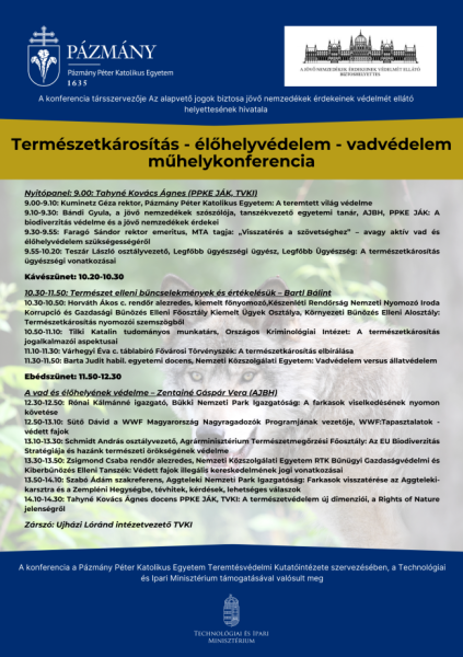Tahyné Kovács Ágnes, a PPKE Jog- és Államtudományi Karának docense az élőhelyek védelme kapcsán előadásában – több előadóval egyetértve – rávilágított arra, hogy az ember felelőssége a teremtett világért bár jogi eszközökkel kikényszeríthető, ugyanakkor elsősorban erkölcsi természetű. A természet jogai szabályozási koncepció számos példája kapcsán elmondta, hogy a jelenség már Európában is jelen van konkrét pozitív jogi formában, ez mégsem a helyes irány a természetes élőhelyek védelmére, hiszen az alkotmányos kereteken belül a jogintézményeink adottak, a jogkövető magatartás a védelmet biztosíthatja. Hidvéghiné Pulay Brigitta, a PPKE Teremésvédelmi Kutatóintézetének munkatársa zárszavában kiemelte mindannyiunk felelősségét a teremtett világért.