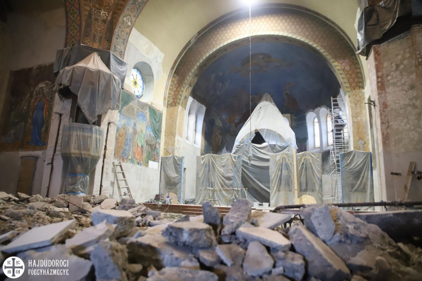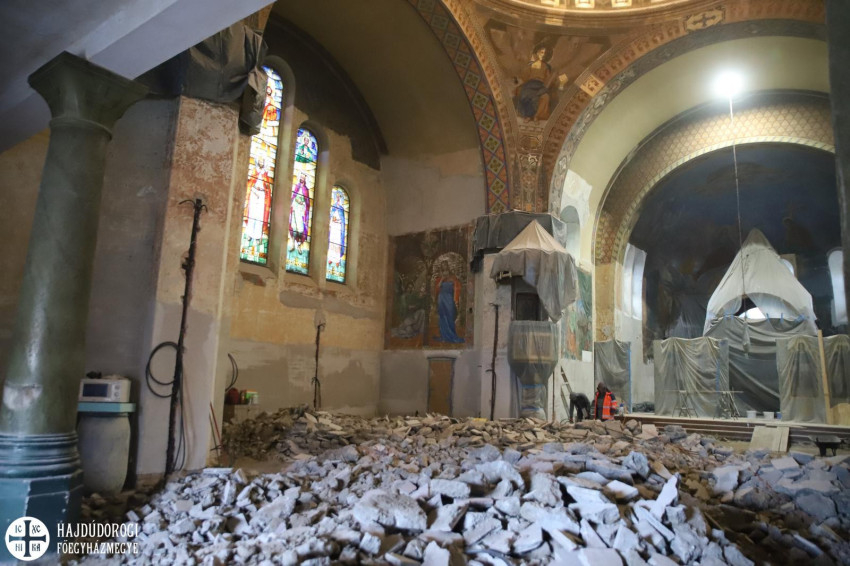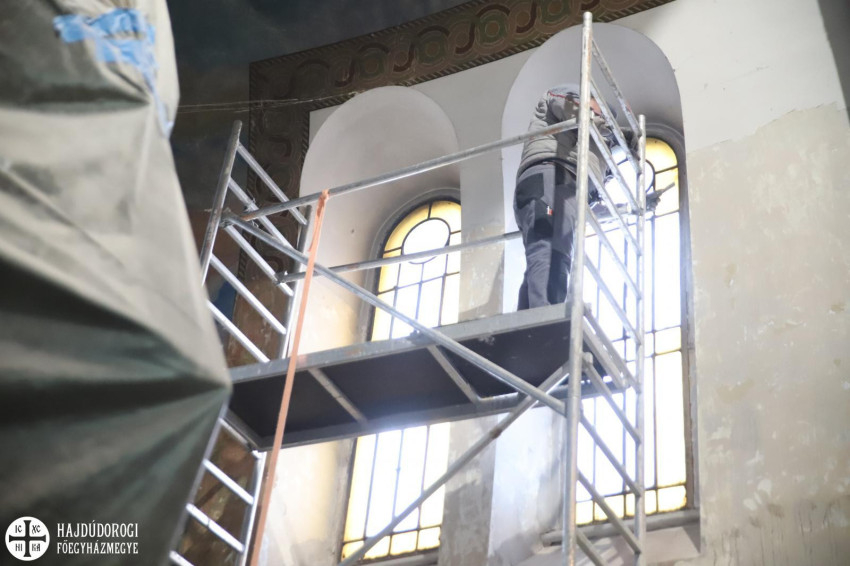 A szentélyben a hat ablakból négyet már feltártak. Két ablaknál a három debreceni mártír festménye van a falon, amit a tervek szerint a restaurátor speciális technikával egyben levesz onnan. Ha ez megtörténik, utána kinyílik majd a másik két ablak is, ami teljesen világossá teszi a szentélyt.