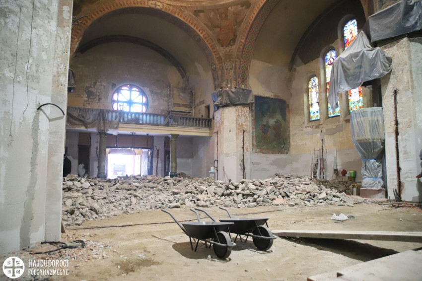 A rétegrendben felverték a betonaljzatot és a rajta lévő burkolatot: ez nagyjából száz köbméternyi betonhulladékot jelent. Ezután körülbelül még harminc centiméter vastagságú földet kell kivinni a templomból, hogy az új padlófűtés rétegrendje megfelelő legyen. Jelenleg az erősáramú kábelek védőcsöveinek beépítése zajlik – mondta el Gál Attila.