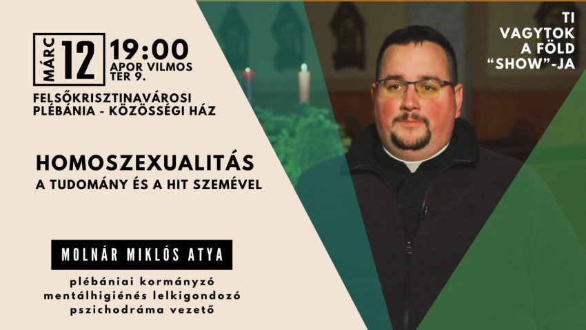 A Ti vagytok a föld „show”-ja ifjú szervezői 2024. március 12-én 19 órától Molnár Miklós atya előadására várják szeretettel az érdeklődőket a Felső-krisztinavárosi Keresztelő Szent János Plébánia Apor Vilmos Közösségi Házába. Miklós atyával, aki mentálhigiénés lelkigondozó szakember is, a homoszexualitásról a tudomány és a hit szemszögéből beszélgetnek majd.