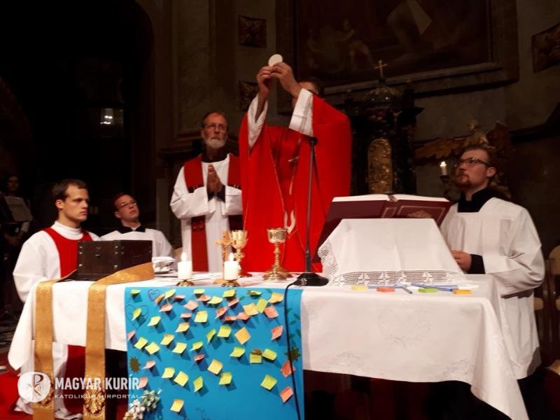 Az egyetemi lelkész arra kérte a résztvevőket, hogy az oltár előtt elhelyezett tablóra ragasszák fel saját imaszándékukat – így a sok-sok különböző szándékot egy szívvel, egy lélekkel, egy élő közösségként ajánlották fel a szentmisében, melyet Ailer Gellért mutatott be Philippe-Marie Van Dael OSM kisegítő lelkész koncelebrálásával.