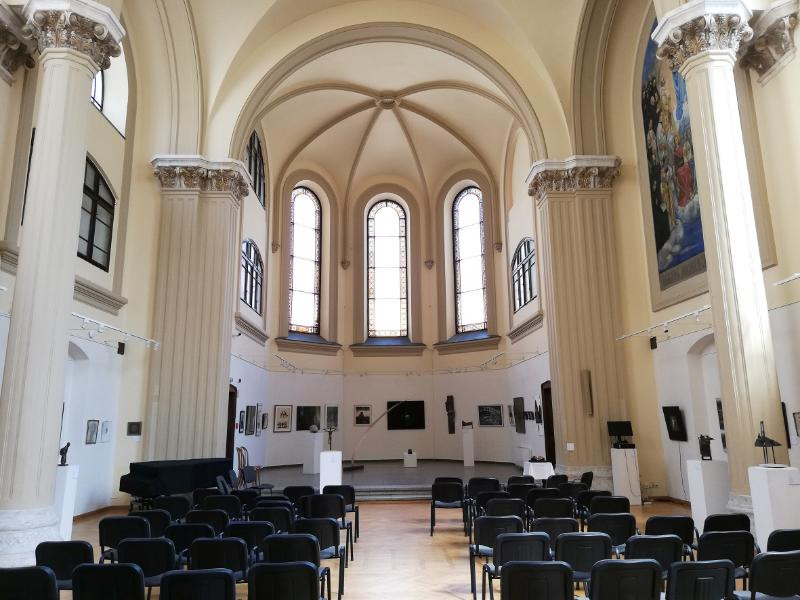 Amikor belépünk a tágas előcsarnok felvezető lépcsőjén a díszterembe – a már említett Párbeszéd Házában, ahol a Jezsuita Kiadó is működik –, grandiózus templomszerű csarnokba érkezünk. A rendkívül tágas teremben minden remekül elfér; széles horizontja, a stílusos ablakain át beáramló természetes fény ideális kiállítóteremmé teszi a helyiséget.